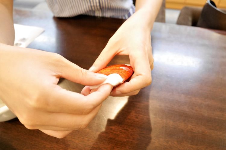 そして、中身が出てこないよう、被せる様に綿で蓋をします。