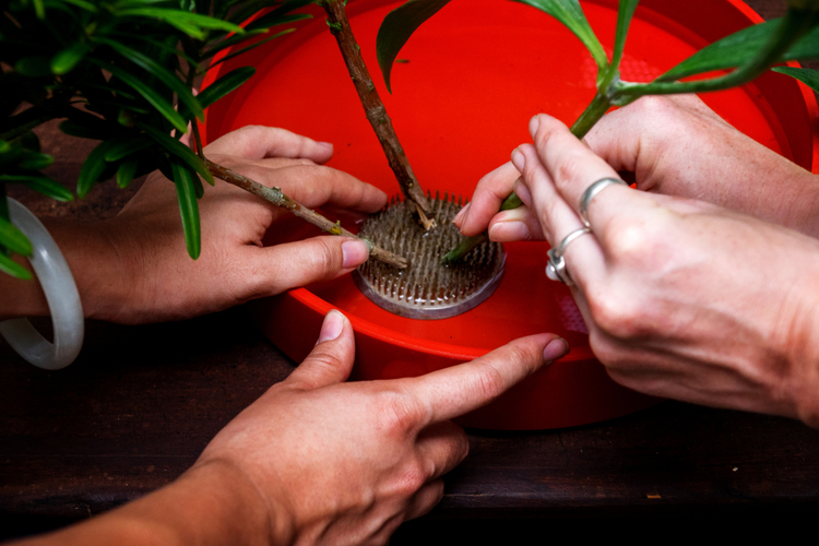 大きさや形は様々ですが、無数の針で花材の向きや角度を固定するもので、特に初心者が思い通りの作品の形をつくるために欠かせない道具です。