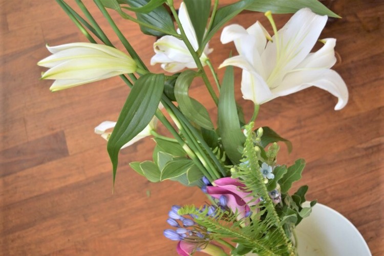 百合の白と、その周りの青の小花達の青色で初夏の涼やかさを出してみました。