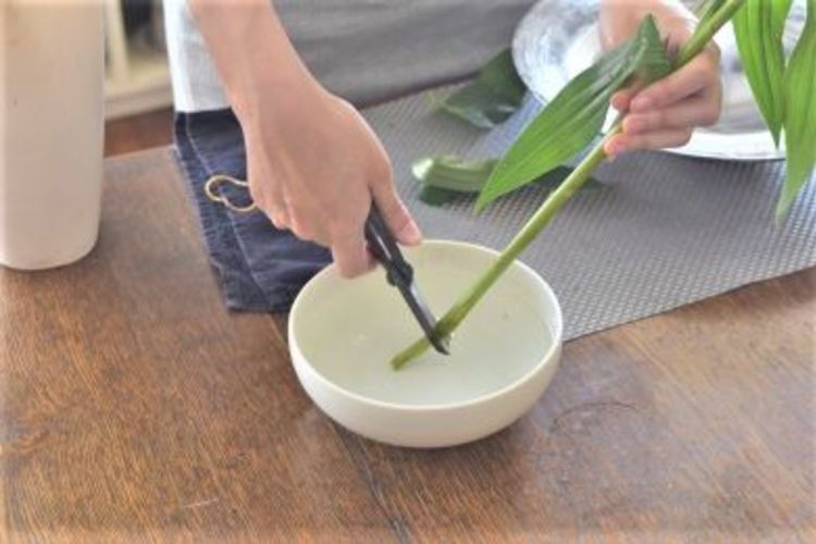 葉っぱが水に浸かってもいけないので、先細りになるように切っていただきました。