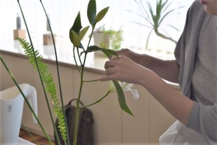 次に、主役の百合の周りに脇役となる草花を生けていきます。