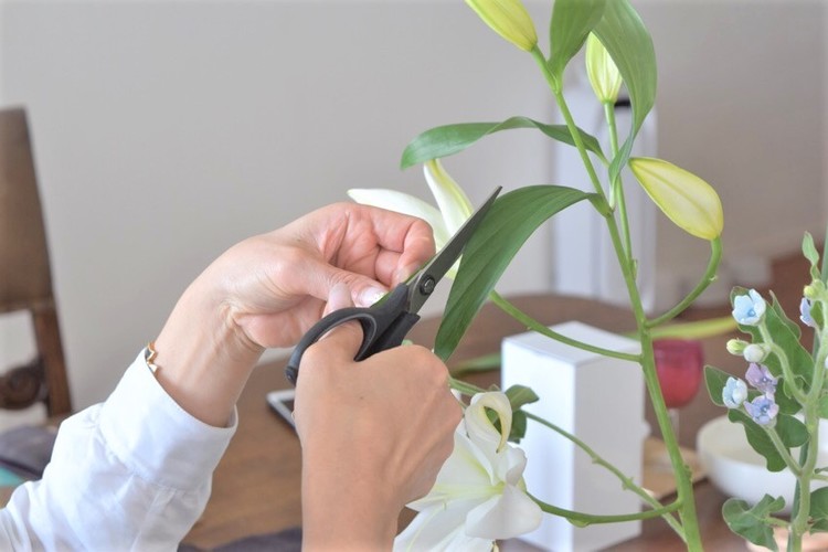 葉が大きくて花に掛かってしまっていた百合の葉も、バランスが悪い部分を切ってもらいます。