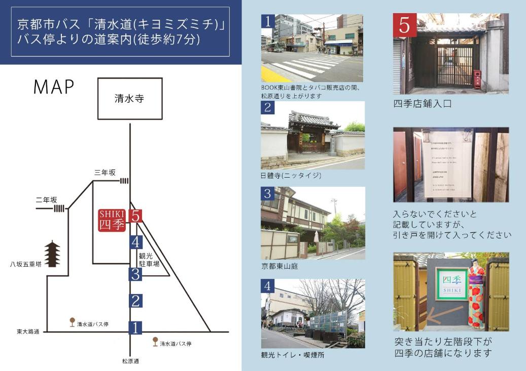 アクセス | 【JR京都駅から】乗車時間約15分 中央口(京都タワー側)市バス乗り場D2から206番乗車、「清水道」バス停下車 【阪急河原町駅から】乗車時間約5分 四条通から東進行の207番乗車、「清水道」バス停下車 【京阪祇園四条駅から】乗車時間約5分 四条通から東進行207番乗車、「清水道」バス停下車 |