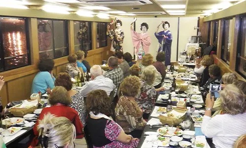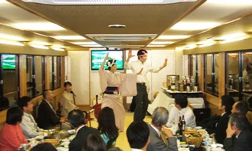 亭燕路師匠一門と一緒にお座敷遊びや、ちょっと大人気分の小話、更にお客様へのかっぽれ踊りの爆笑レッスンなどで、船内の宴会は大盛り上がりになることでしょう。