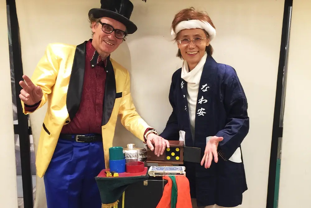 パントマイム、ジャグリング、バルーンアート、マジック、ダンス等、スピード感ある盛りだくさんのパフォーマンスをお楽しみいただけます。爆笑トークは、外国のお客様にも大人気です。
