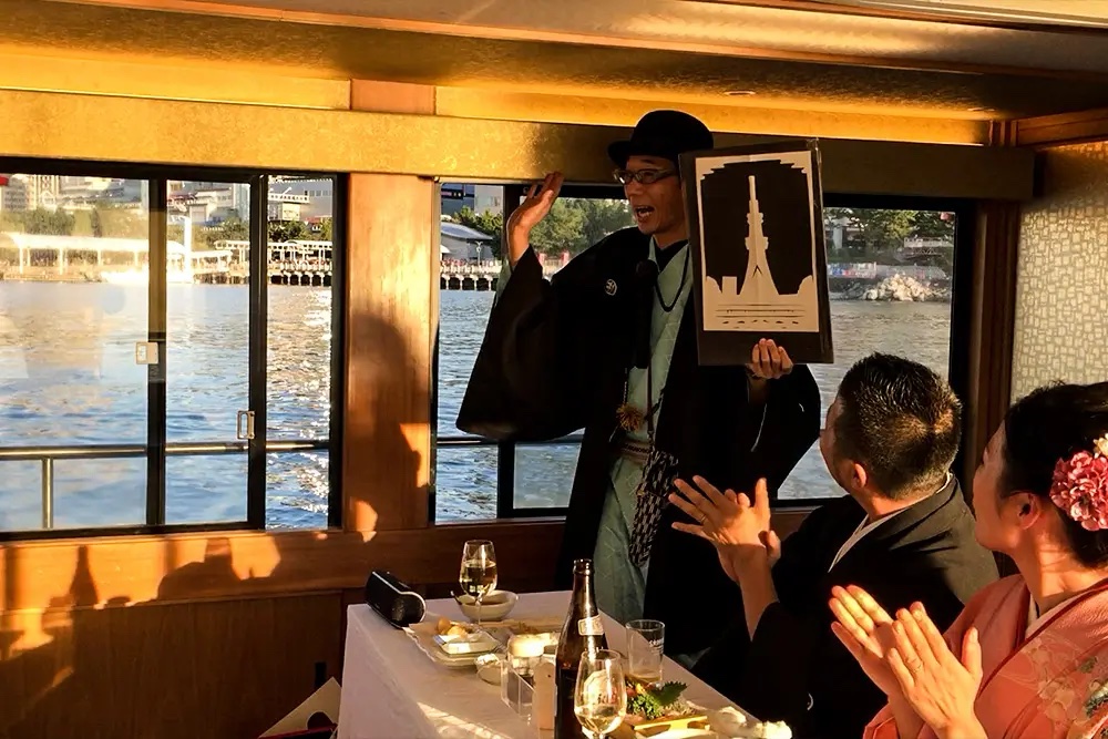 浅草の花柳界にたった5人しかいない【たいこもち】と呼ばれる幇間という名の芸人「櫻川七好」の屏風芸やかっぽれ、小話を屋形船でお楽しみいただけます。