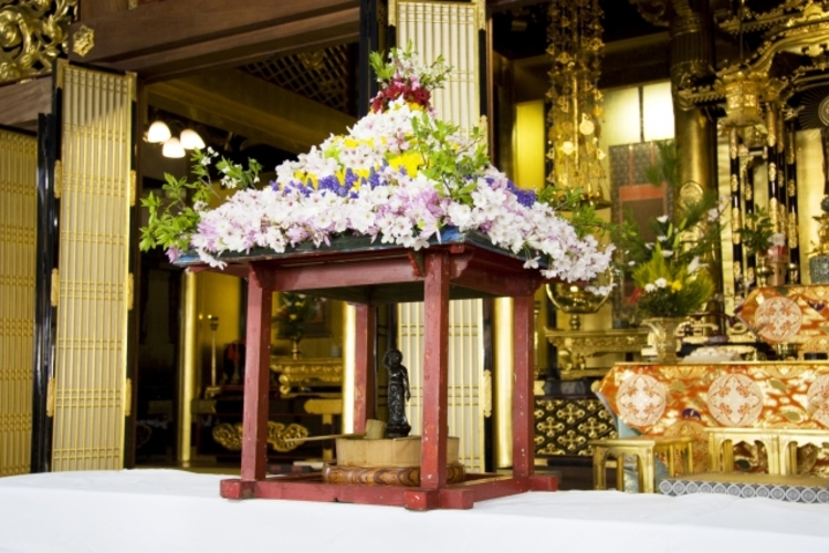 花祭りでは、その名の通り、花をふんだんに飾った「花御堂」という小堂に釈迦の誕生時の姿をかたどった誕生仏を祀り、参拝者はこの誕生仏に甘茶をかけてお祝いします。