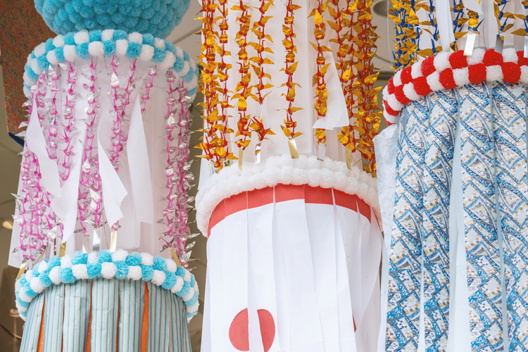 カラフルな長い紙が華やかな、「仙台七夕まつり」の中心となる飾りです。