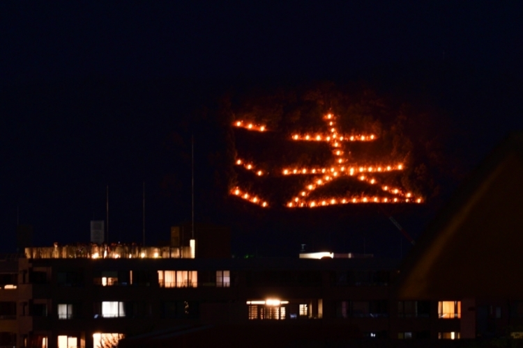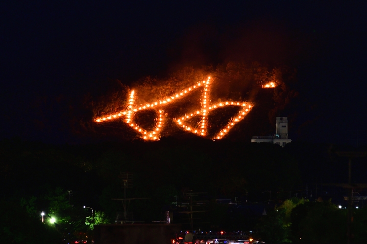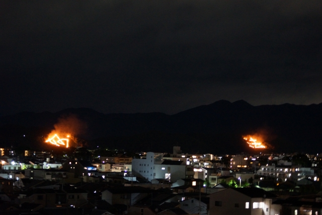 京都の街を取り囲む山々で、5つの大規模な「送り火」が焚かれ、燃え上がる火で「大」「妙」「法」の文字と「船」「鳥居」の形が描かれます。