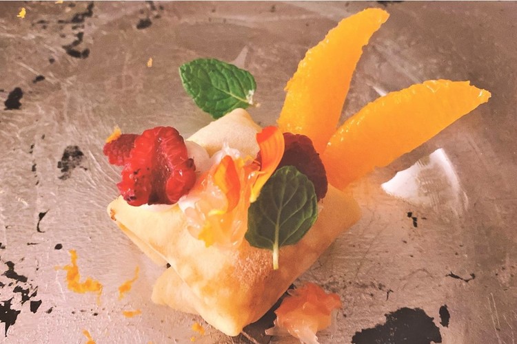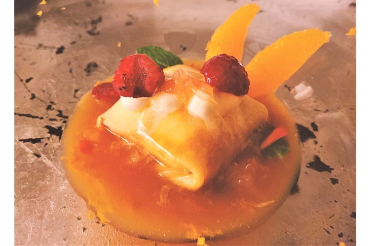 香り高いバニラアイスがクレープに包まれていて、その上から、爽やかな温かいオレンジのソースをかけていただきました♡