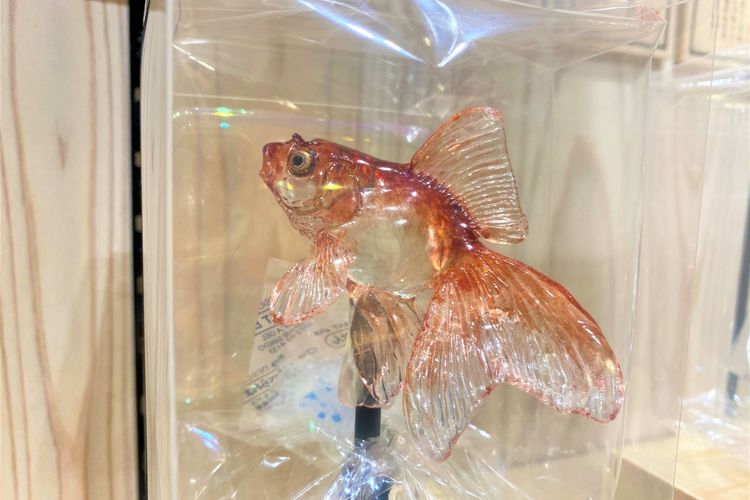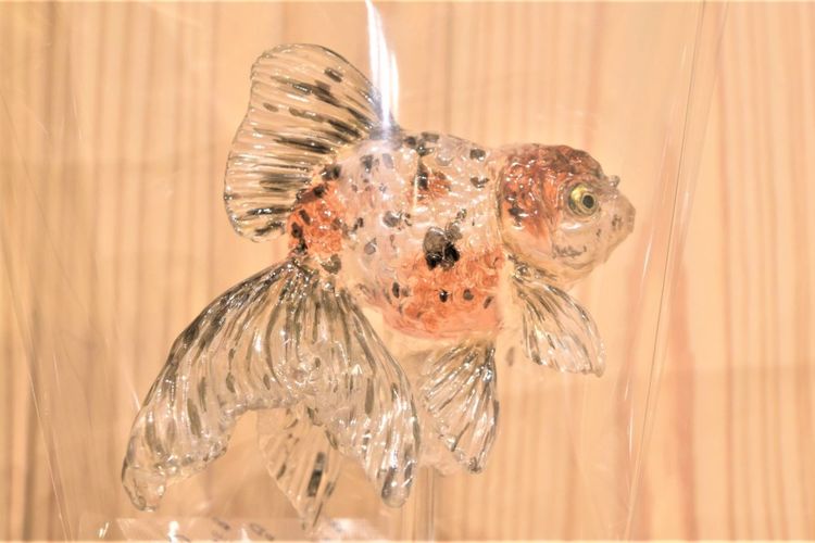 手塚新理さんの代表作は、透明な飴細工の「金魚」。