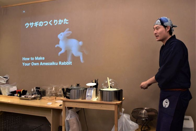 手を洗ったら、今回の飴細工体験を教えてくれる鷲頭涼太さんに、動画でウサギの作り方について詳しく解説してもらいます。