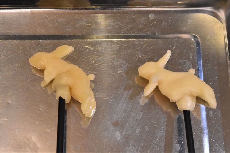 まずは、まんまるの飴の塊からウサギの耳を作ります。
