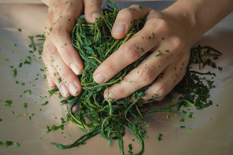 乾燥しにくい茎などの水分もよく揉み出して、茶葉全体の水分を均一にします。