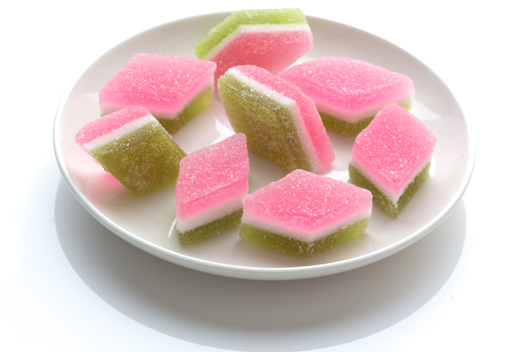 寒天に砂糖や水あめを加えて煮て形に入れて固めたもので、透明に仕上がります。