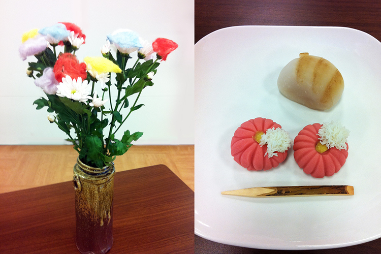 白あんに小麦を混ぜてむしたこなしで菊の花を作り、練りきりを細いそぼろ状にして、花の上にふんわりと盛り付けたものなどです。