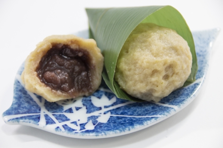 すりおろした芋に砂糖と米粉を加え混ぜ合わせた生地で、餡を包んで蒸して作ります。