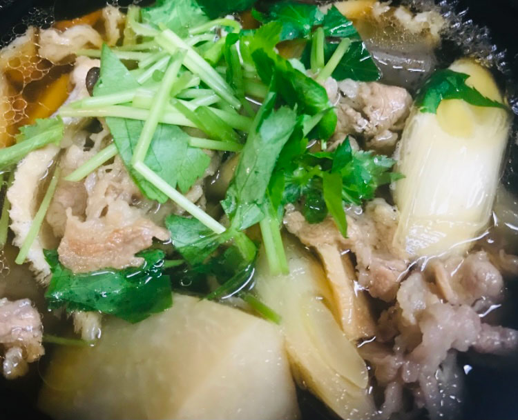 うるち米を潰して木の棒に握り付けて焼いたきりたんぽを、鶏と根菜の醤油仕立ての汁に入れて煮込んでいただく鍋料理です。