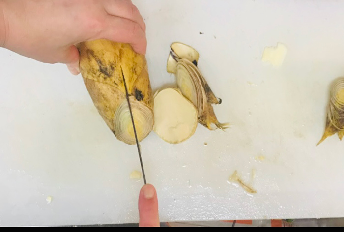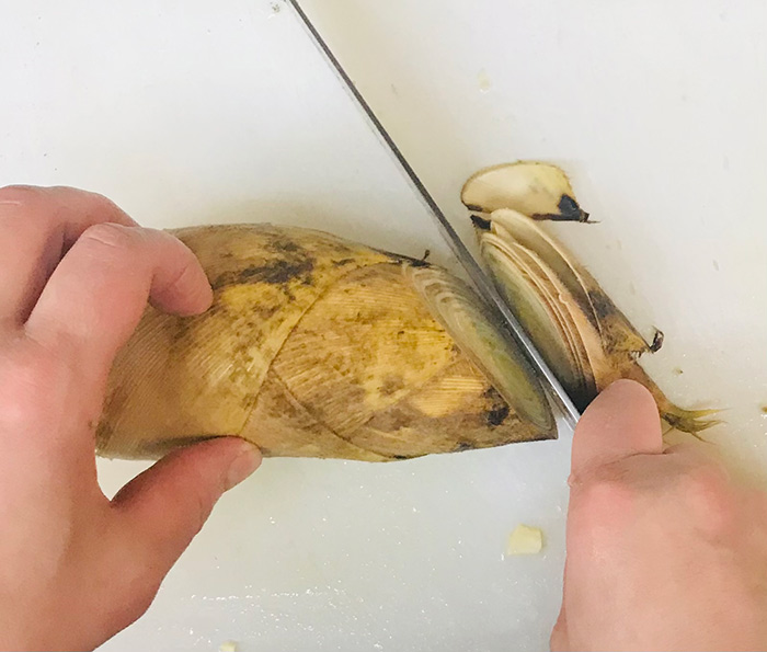 1)たけのこの先端から3㎝くらいのところを斜めに切り落とします。