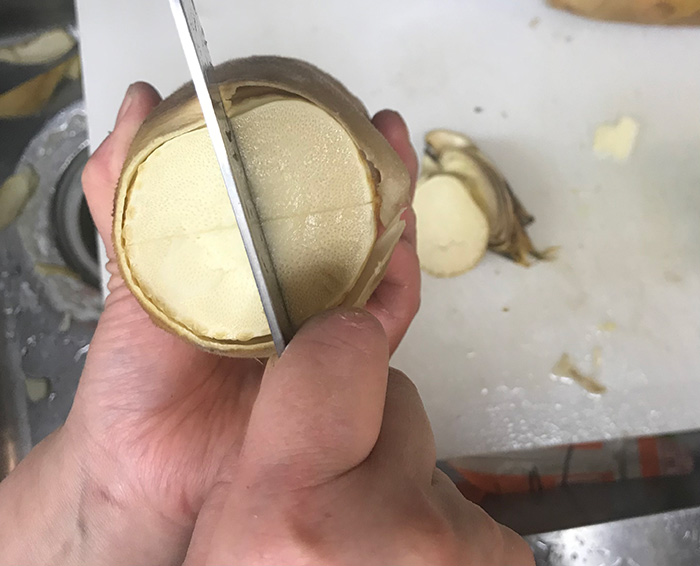 7)アクが抜けたら、表面を洗い、上の切り込みから指を入れて、固い皮をはぎます。