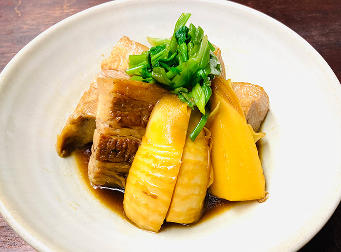豚肉の角煮に食べやすく切ったたけのこを入れて、一緒に10分くらい煮込んでください。