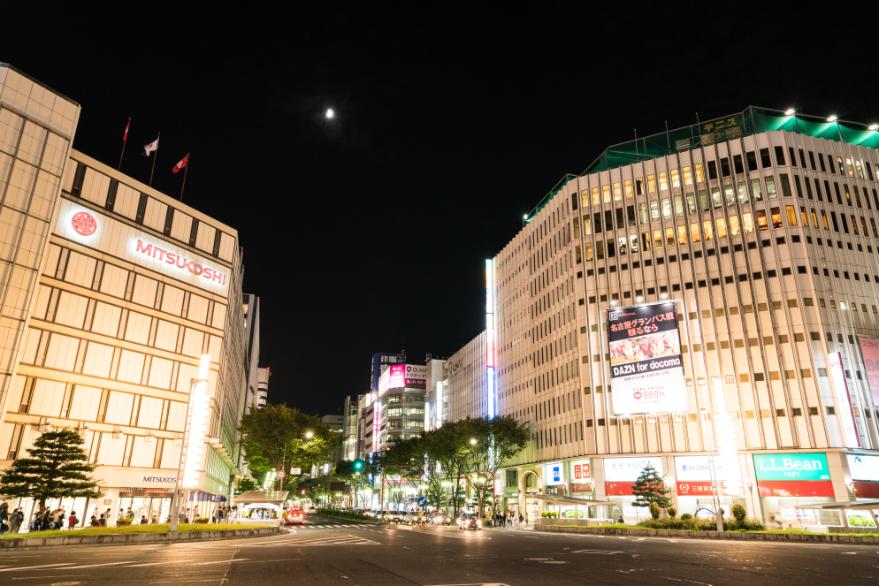 「広小路栄」バス停周辺には、三越や松坂屋などの高級デパートが立ち並びます。