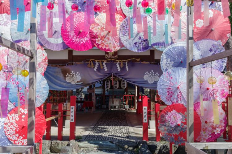 神社と聞くと地味なイメージがあるかもしれませんが、境内には和傘が飾られるなど、一年を通して四季折々の装飾が施されています♪