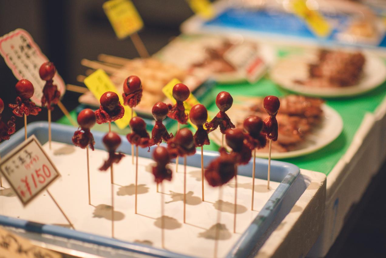 約400年の歴史を受け継ぐ錦市場は、東西におよそ390m続く道沿いに魚屋や肉屋、京漬物店、飲食店などが立ち並ぶ市場。