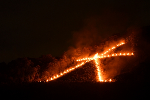 かがり火を5つの山で焚き、お盆にお迎えしたご先祖様の霊をあの世へと送る盂蘭盆会の行事で、京都市の無形民俗文化財です。