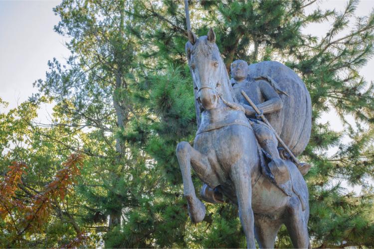 「利家公像」は、馬に乗り、槍をかかげた勇壮な姿が模されています。
