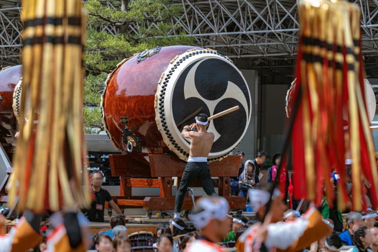 金沢駅のシンボル“鼓門”をバックに、太鼓・ほら貝の勇壮なファンファーレが鳴り響く“百万石行列”では、豪華絢爛なパレードが約4時間金沢市内を練り歩きます。