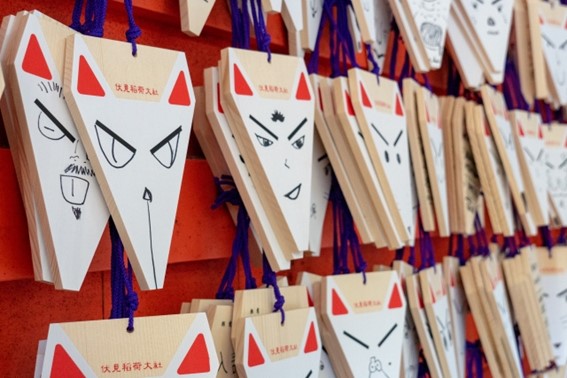 こちらにはきつねの顔の形をした絵馬が並んでおり、参拝者がそれぞれ描いたきつねのイラストが楽しめます。
