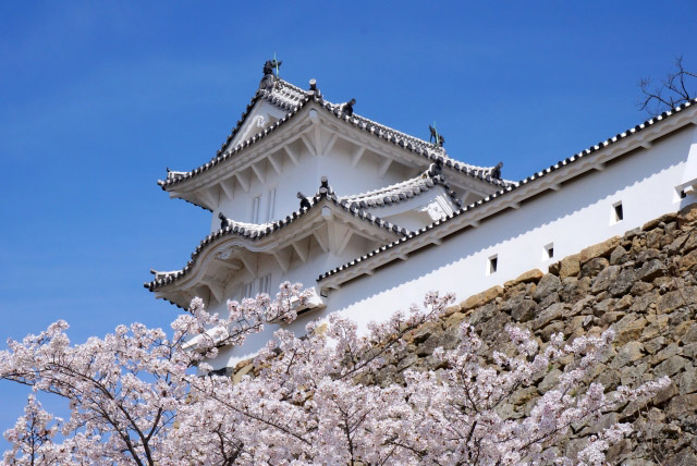 別名「白鷺城(はくろじょう)」とも呼ばれ、白亜の天守群が青空に翼を広げた白鷺のように優美な姿で親しまれています。