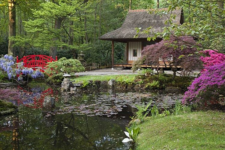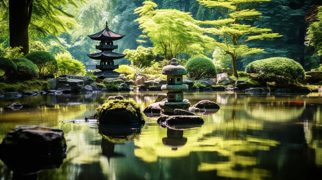 「日本庭園」とは主に、中心に配置された池、勾配をつける築山、そして、さまざまに組み合わされた石で構成されており、自然の風景を象徴的に再現しようと試みたものです。