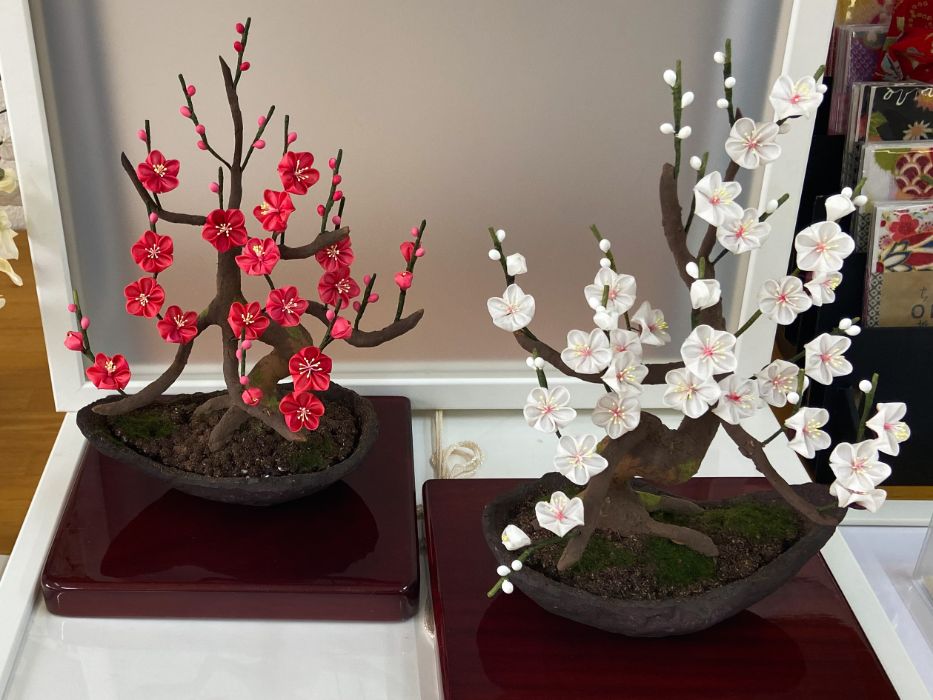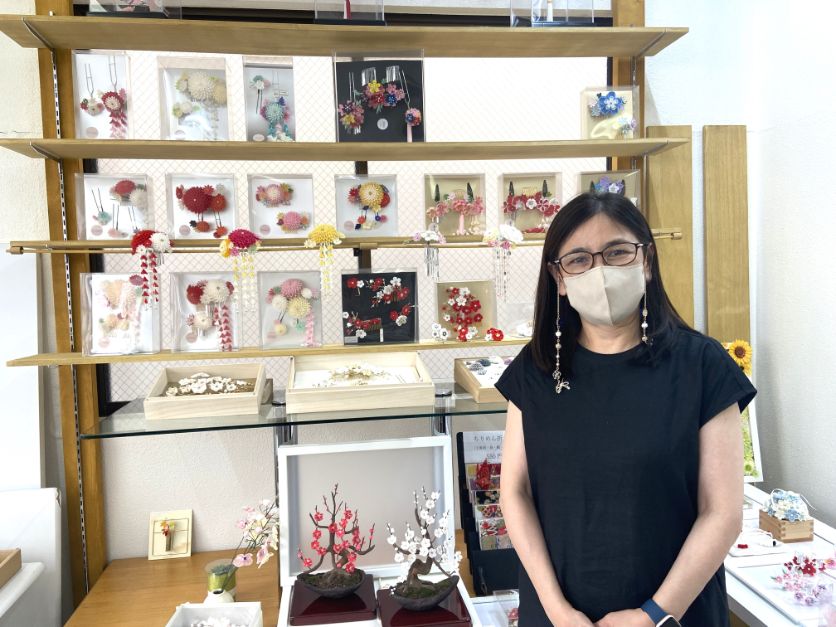 そんな「つまみ細工 一凛堂」には、王道のつまみかんざしなどはもちろん、つまみ細工の鶴を施した羽子板や、つまみ細工の盆栽など、職人の技術が詰まった繊細な作品が盛りだくさん!