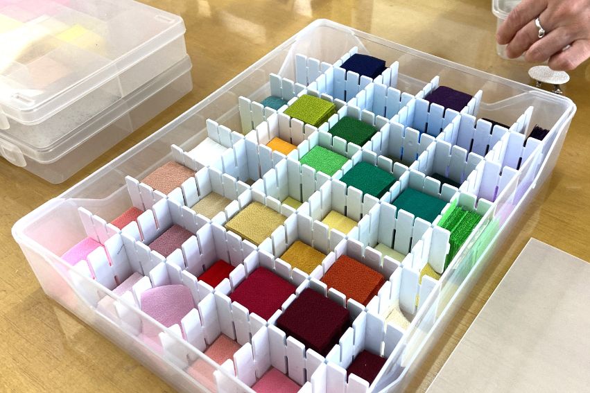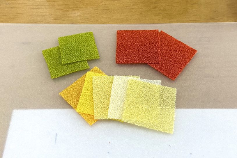 すでにカットされた一越ちりめんの中から、花びらや葉の部分に使いたい色を選んで取っていきます。