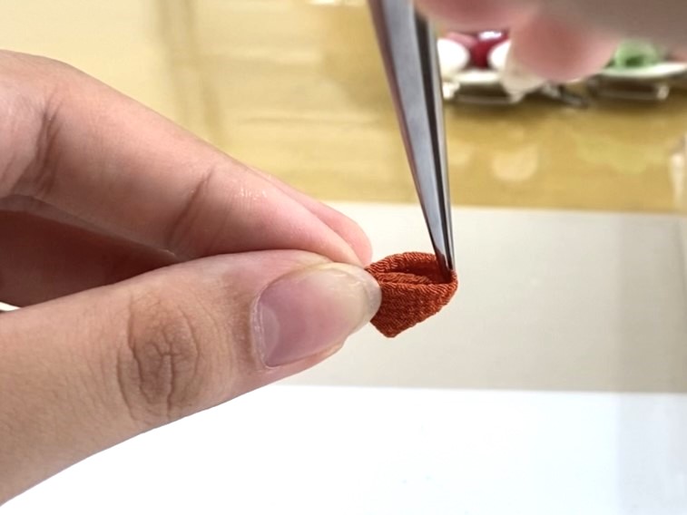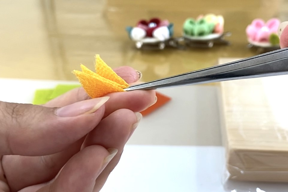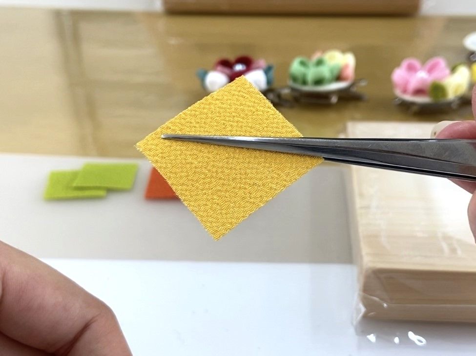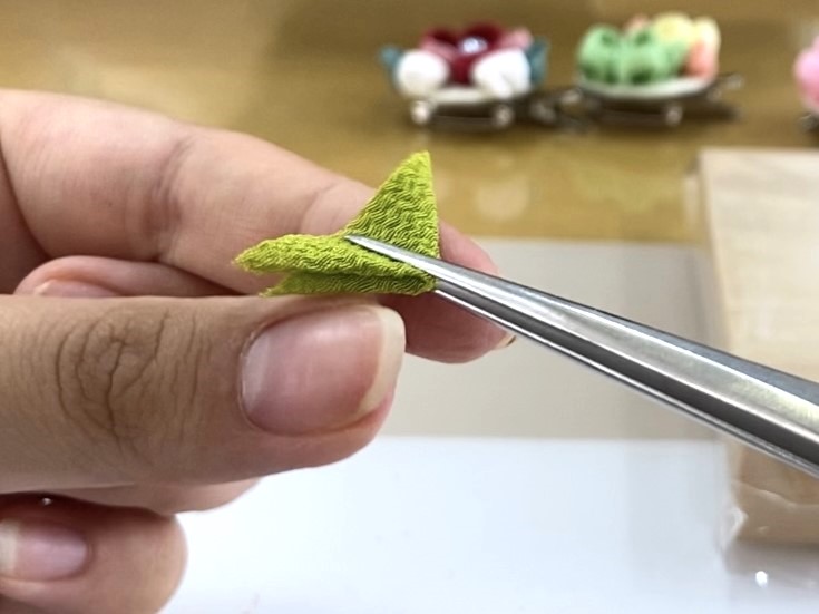 丸つまみと同じ手順で2回折ったら、今度は布の切り口と反対側の三角形の頂点から切り口のど真ん中に向けてピンセットで挟み、折り上げます。