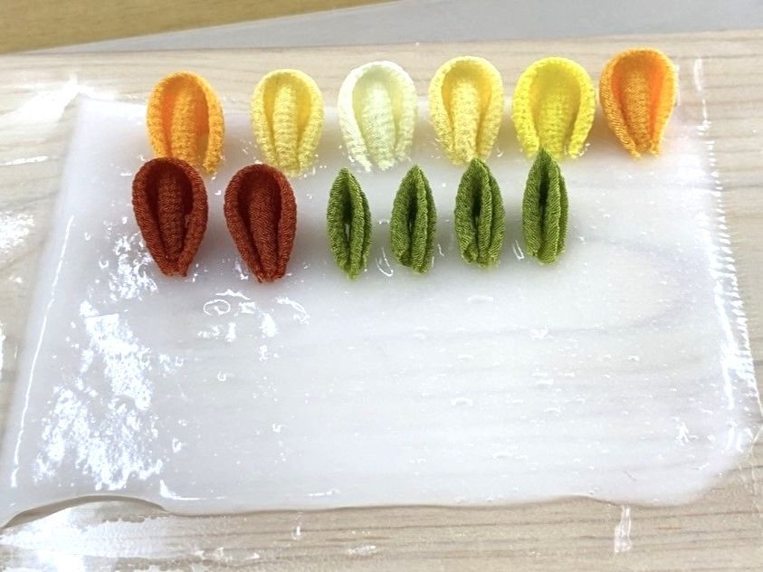 できた花びらは、先ほど用意したでんぷん糊に切り口を埋め込んで置いておきます。