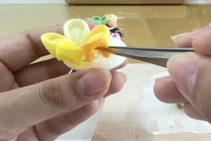 バランスを見ながらピンセットで整えて、花の中心にパールビーズを置いたら、完成です…!