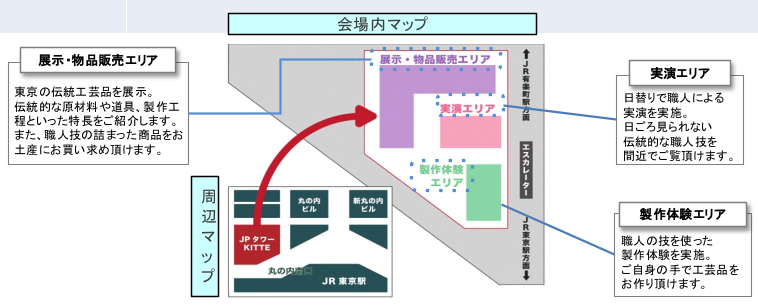 こちらのイベント会場は「展示・物販エリア」、「製作実演エリア」、「製作体験エリア」の3つのエリアに分かれており、それぞれ伝統工芸品の楽しさ・魅力を存分に学ぶことができるコンテンツがたくさん用意されています!