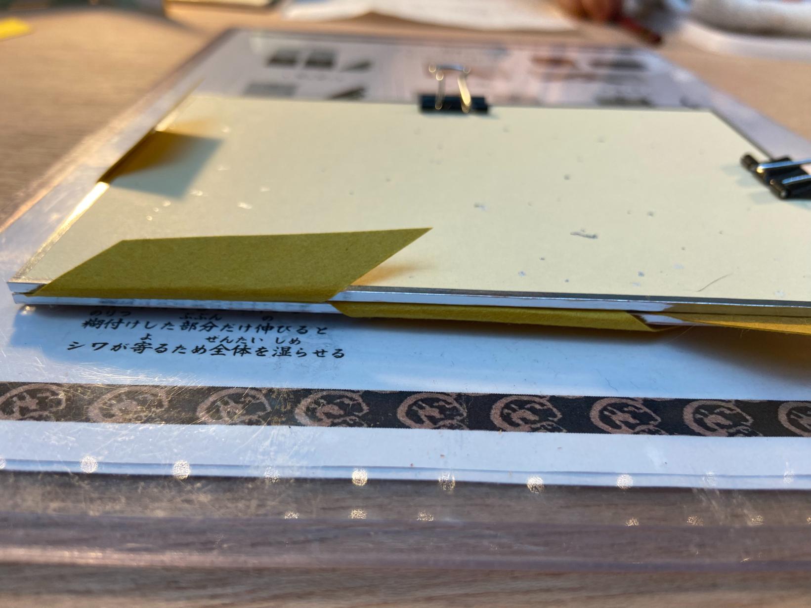 幅の広い豚毛の刷毛に持ち替えて、台紙の四辺に約1cm幅ほど糊を塗っていきます。