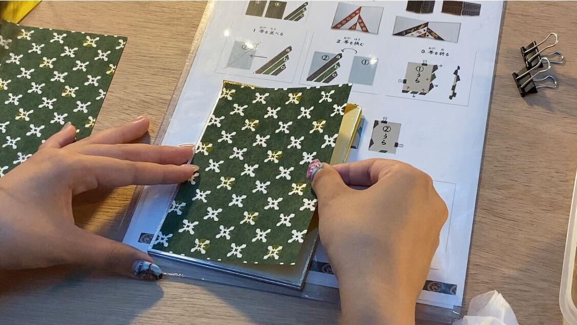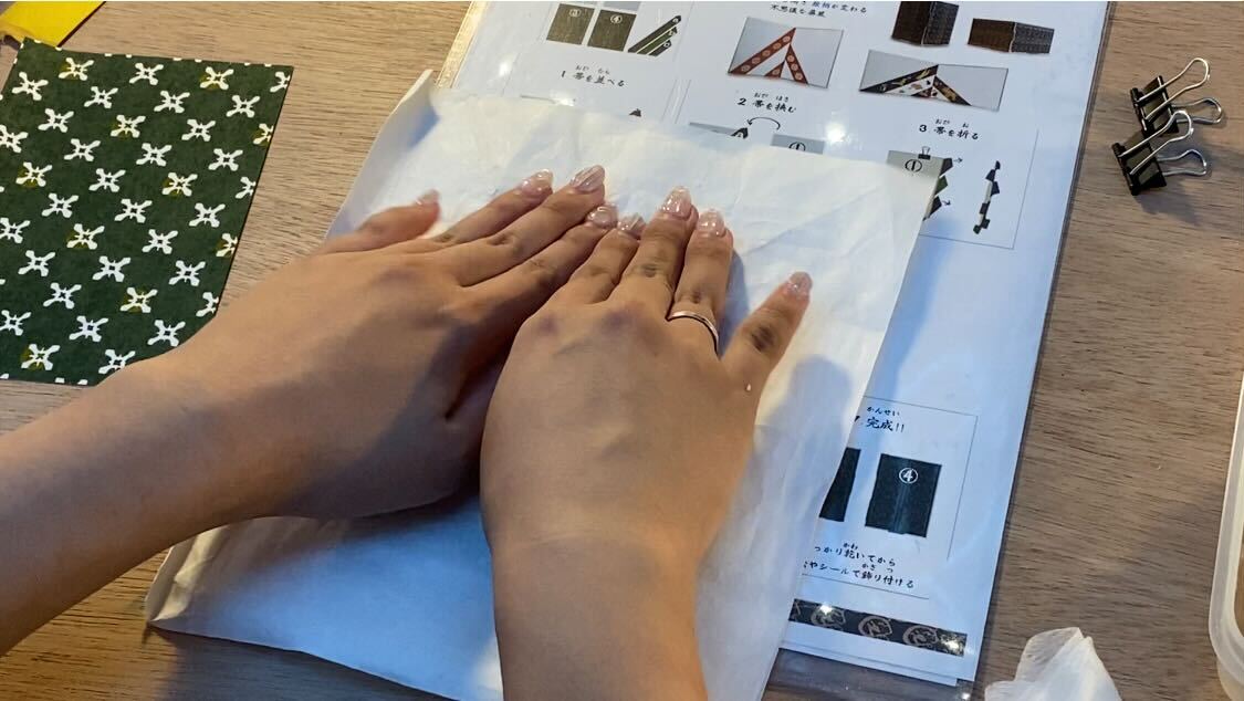 次に、厚紙の縁に貼られた銀色の部分が見えるよう、角を合わせながら千代紙を慎重に載せます。