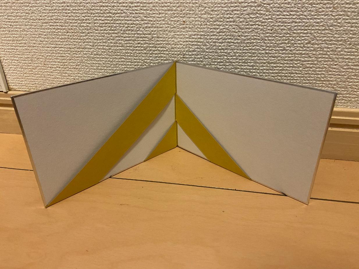 材料を選んだら、まずは白い厚紙を2枚重ね、角と角を合わせて間に帯を並べていきます。