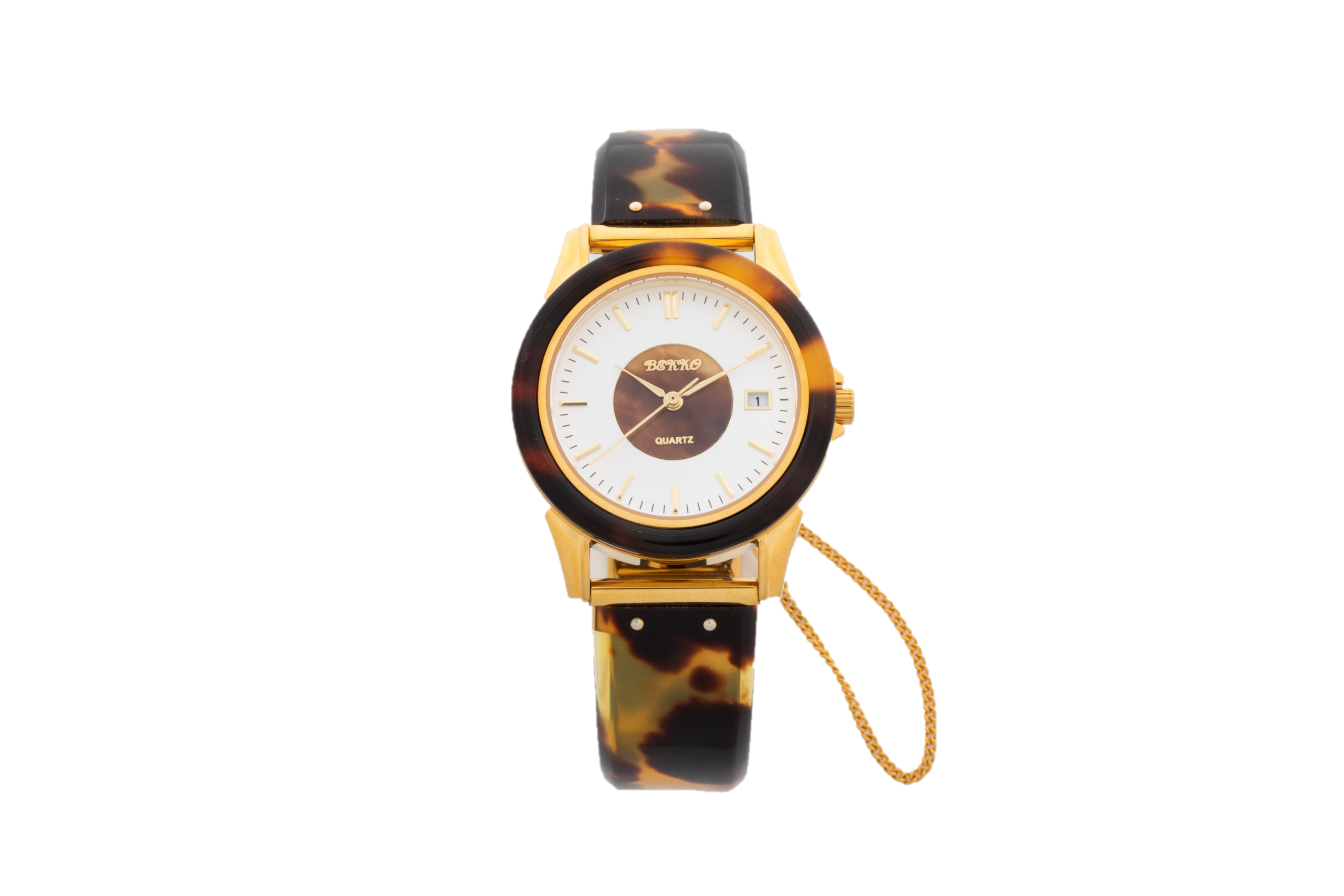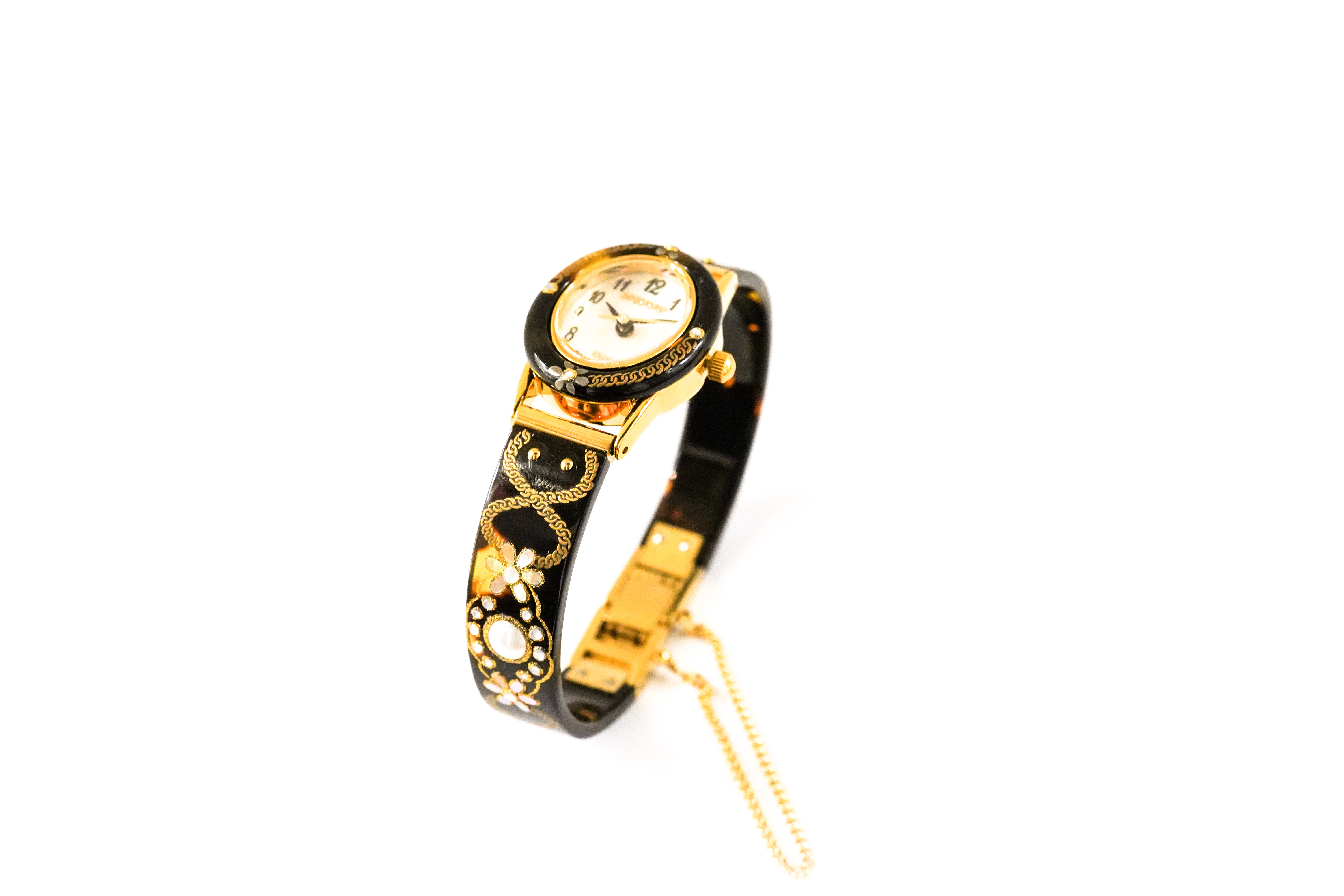 人気商品は、江戸べっ甲のフレームが美しい腕時計。