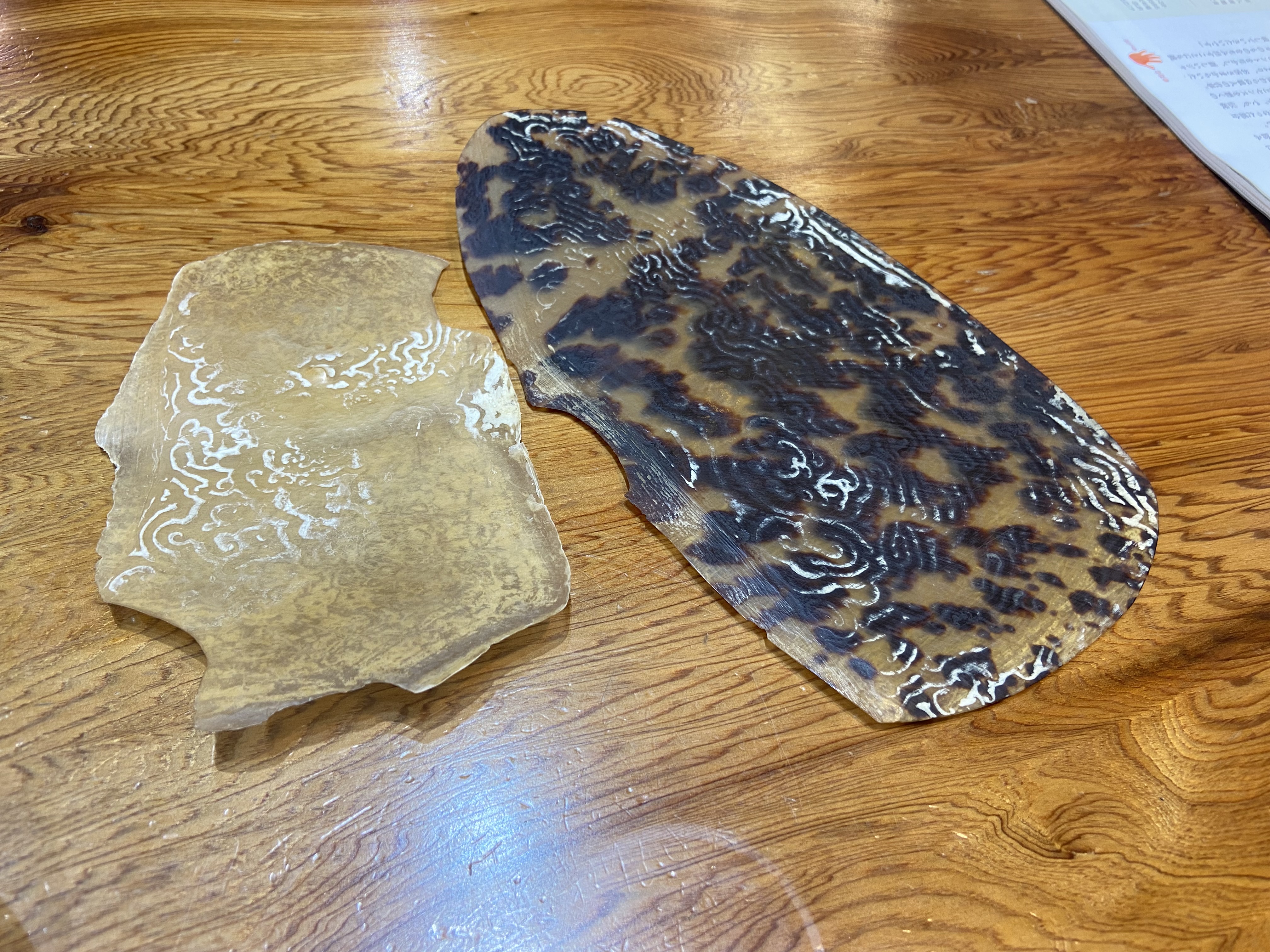 膠質の玳瑁を使うことで、接着剤を使用することなく、水や熱を加えるだけで甲羅同士を貼り合わせることができるため、玳瑁の甲羅を使う必要がある、ということでした。