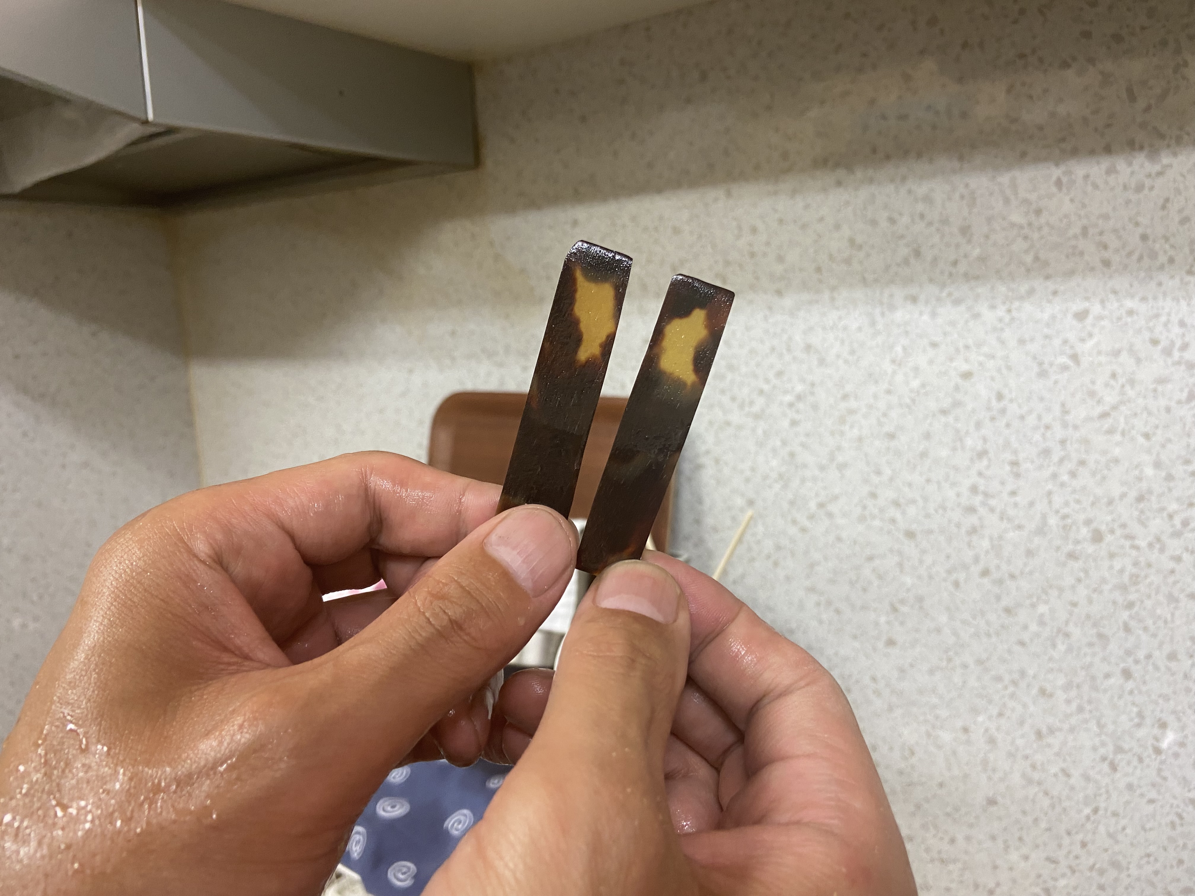 木の板を濡らして使用するのは、この後の工程で甲羅が焦げてしまうのを防ぐためです。