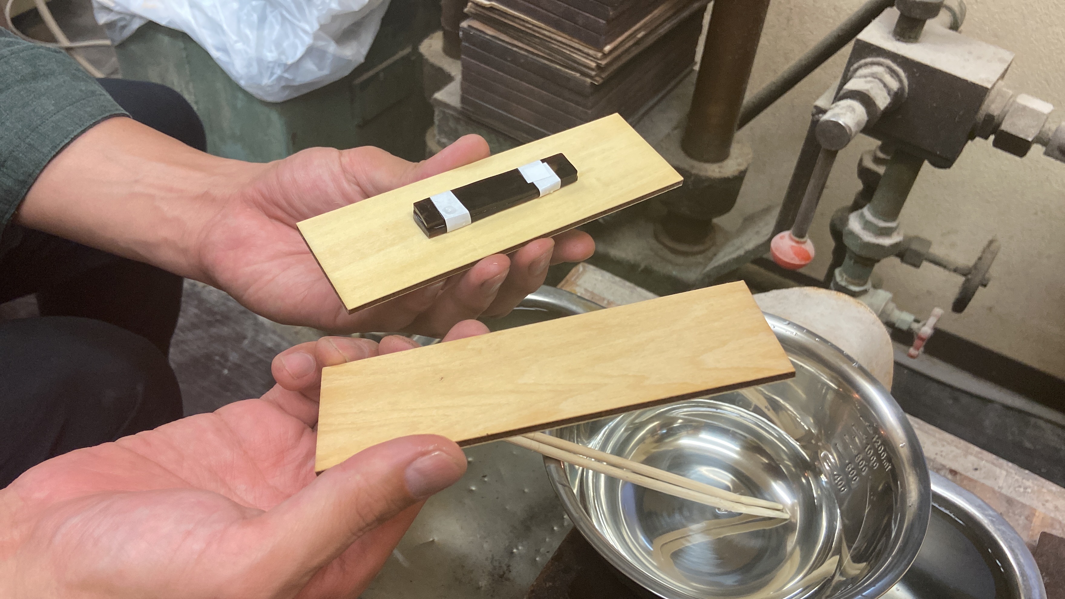 熱と圧力により張り合わさったべっ甲材を取り出したら、鉄板の上に部材を乗せて水をかけ、一度蒸かしていきます。