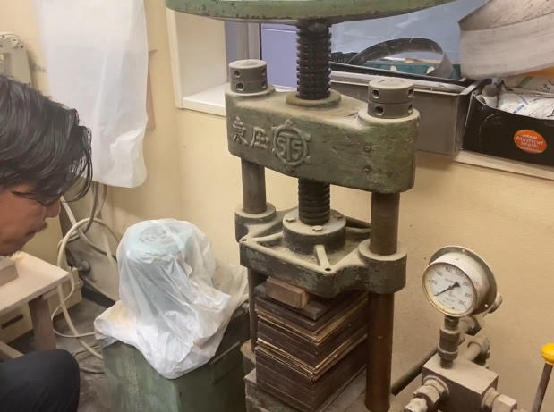 万力の上に部材を置いたら、上から熱した鉄板をのせ、圧力をかけていきます。