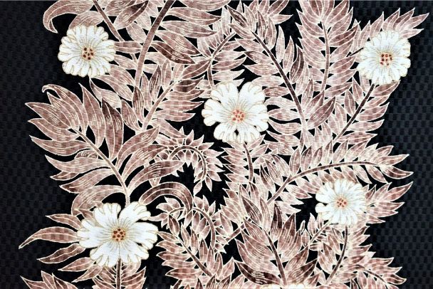 “木版摺り”を基調としつつも型紙による“渋型捺染摺り”や、金銀で彩る“金銀砂子手蒔”など多様な様式が生まれ、さまざまな文様に彩られた洗練されたデザインへと発展しました。