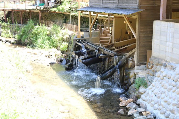 20日ほどかけて原料である陶土を挽く唐臼は、川の流れを利用しています。